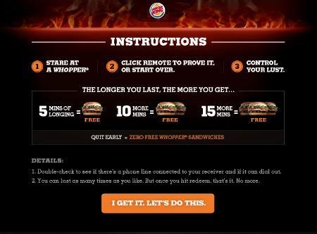 Em ação exclusiva em 2011 no meio televisivo o BK inovou na divulgação de sua nova promoção na DirecTV. Colocando à disposição do usuário um canal com uma imagem do Whopper. Quanto mais tempo o telespectador fosse impactado pela imagem em frente à TV, assistindo o sanduíche girar, poderia ganhar um Whopper. Alertas aleatórios aparecem na tela como Pop Up e não havendo click a promoção seria invalidada, como forma de garantir uma operação do ação.
