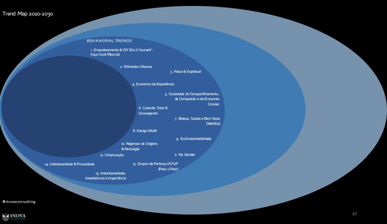 São tendências como do futuro do trabalho, ambientes sociais e suas mudanças, aspectos econômicos, políticos, ambientais, tecnológicos e comportamentais do consumo. Visões que não mais pertencem somente ao futuro, mas o já aqui presente, como o uso de serviços no lugar da posse de objetos, assinaturas correntes e não mais compras pontuais de forma majoritária. São tendências que mudam indústrias como a de automóveis e cria outras, como a do Uber, Cabify e Lyft e sempre em projeções em escala.