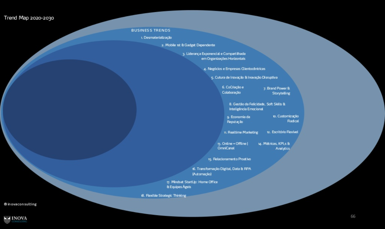 O relatório de tendências Next 2020-2030 da Inova Consulting & Inova Business School apresenta o que virá nos próximos anos. Considerando agrupamentos por megatendências, tendências comportamentais e tendências emergentes, Luiz Rasquilha, CEO Inova, traz informações que podem nortear movimentos próximos de forma mapeada e setorizada, possibilitando poder ler melhor o presente e suas rápidas mudanças percebidas.